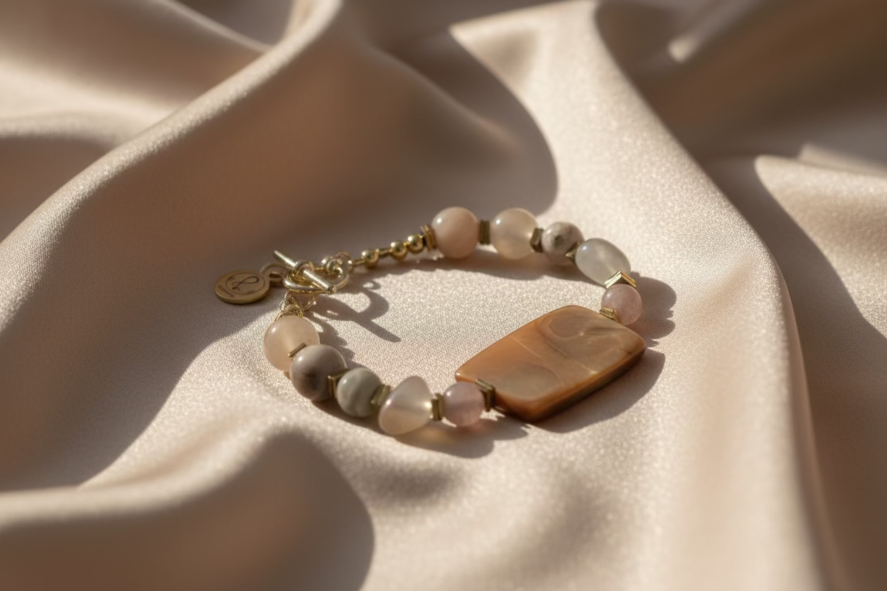 This handcrafted bracelet features a luminous rectangular Mother of Pearl Centerpiece, admired for its natural iridescence and soft, golden glow. Each movement reveals subtle reflections, making this piece quietly striking and effortlessly elegant.