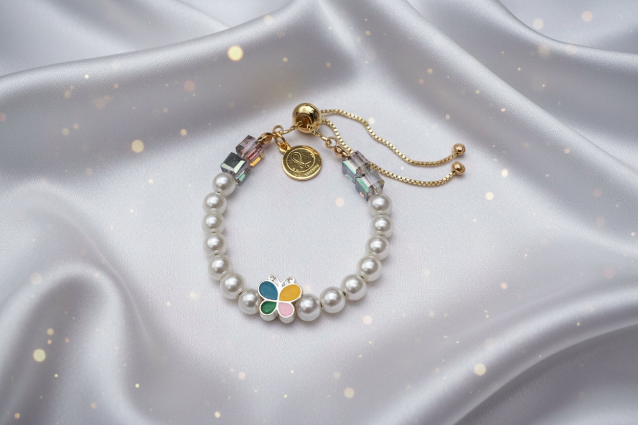 Designed with soft pearl-style beads and finished with a charming rainbow flower centerpiece, this bracelet feels gentle, happy, and full of light. Shimmering crystal-style beads and gold-tone details add a touch of sparkle, while the adjustable sliding chain ensures a comfortable and flexible fit.